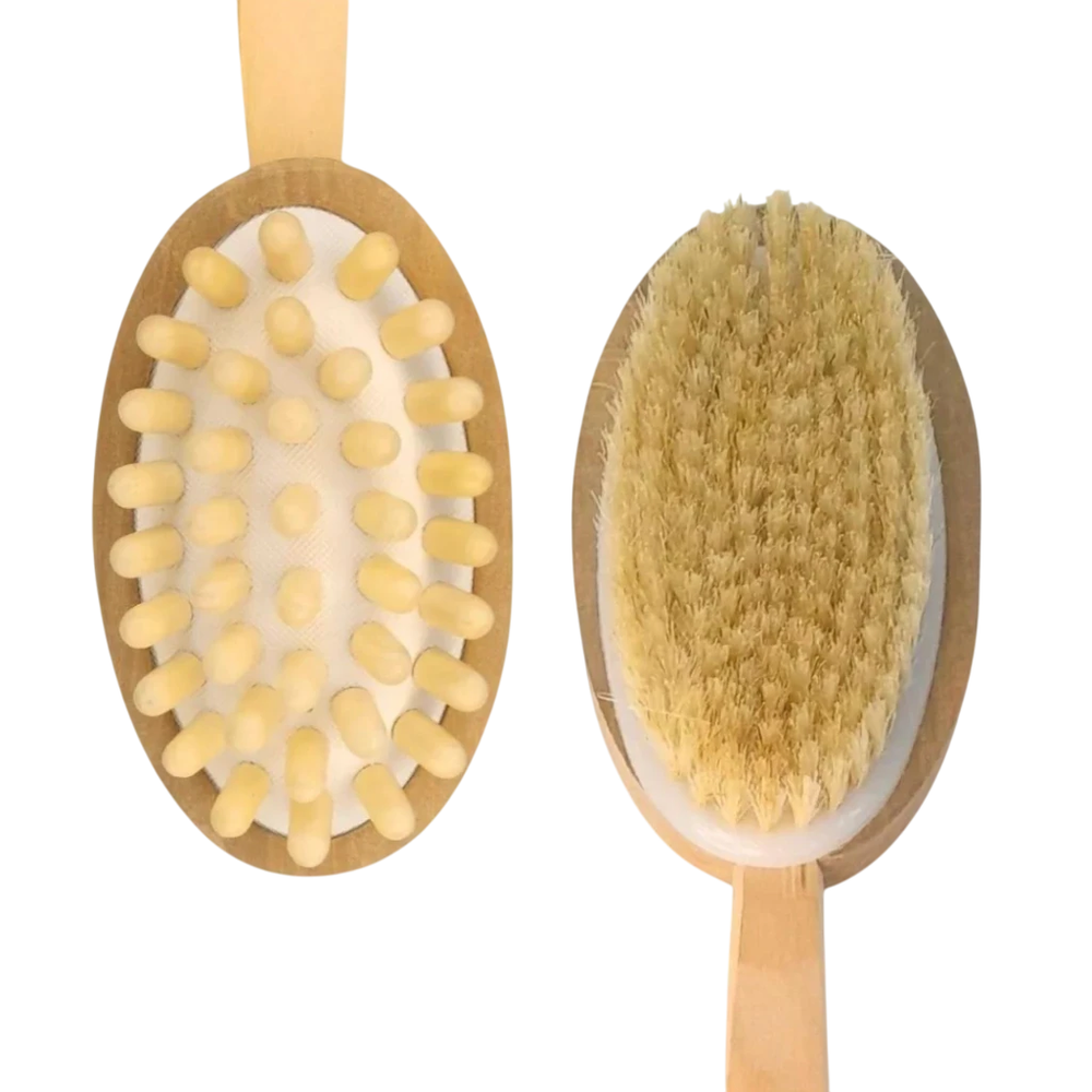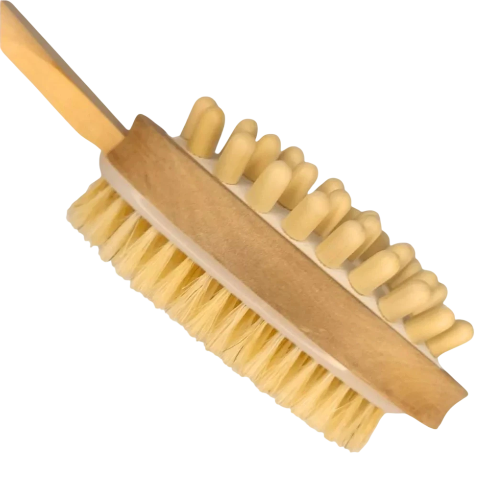 Diseñado para estimular la piel y mejorar la circulación sanguínea, este cepillo de doble cara combina funcionalidad y bienestar. Cuenta con cerdas naturales de alta calidad que ayudan a eliminar impurezas, células muertas y grasa acumulada en la piel de forma suave y efectiva.