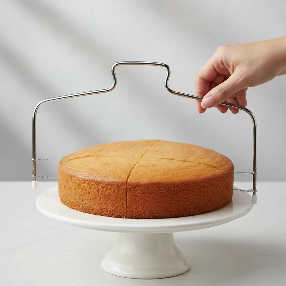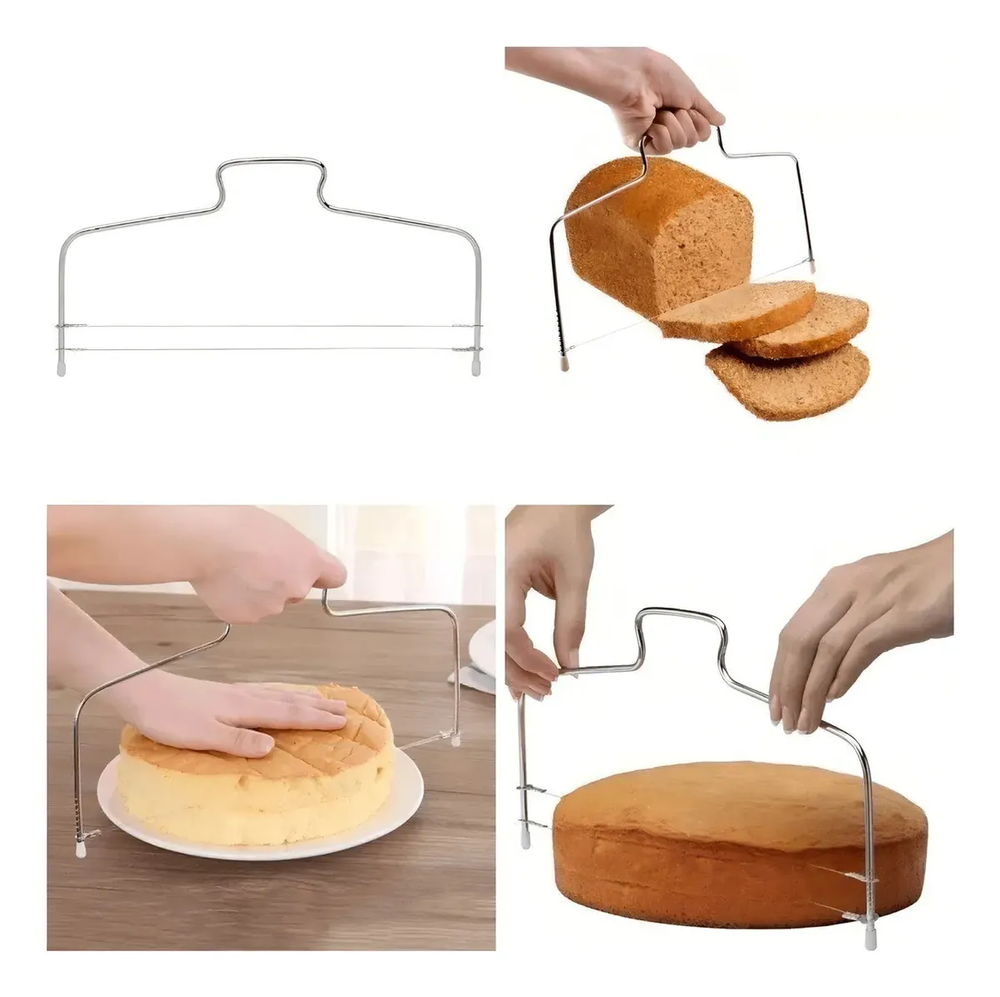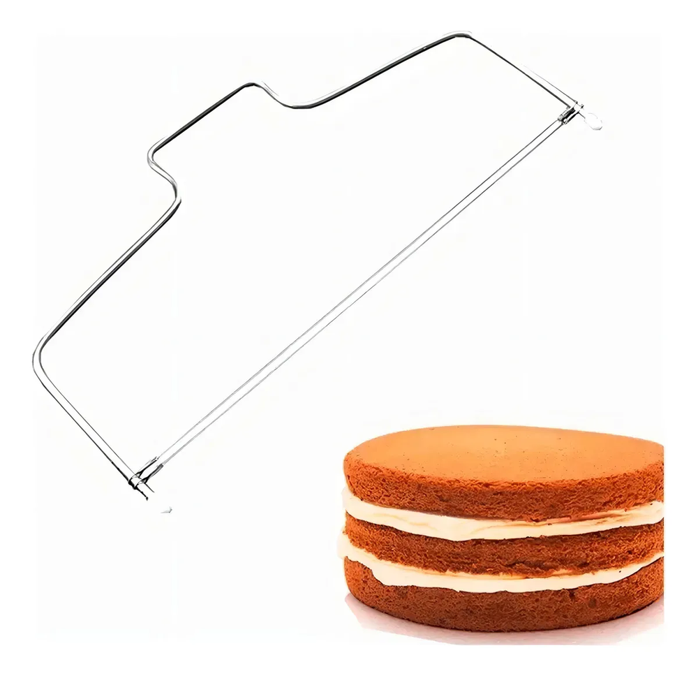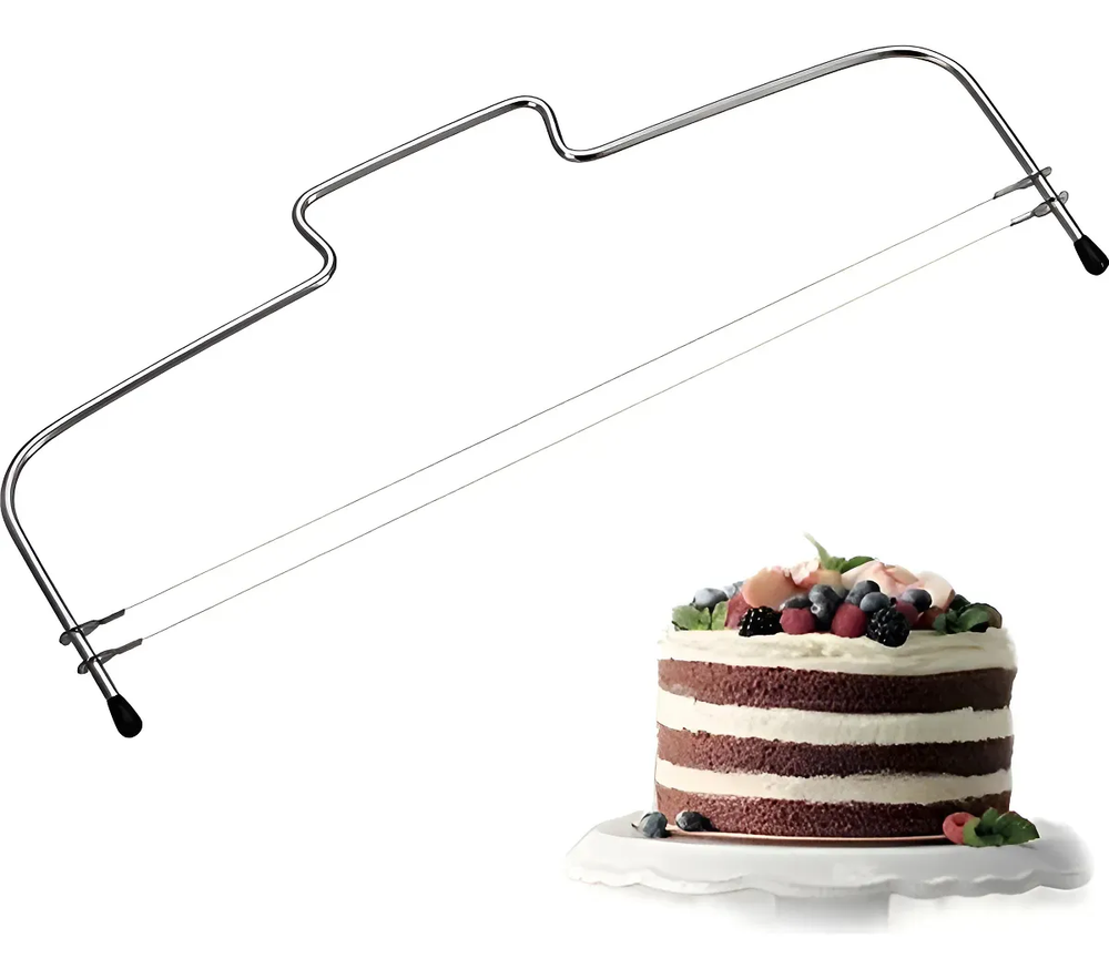 Herramienta ideal para repostería que permite cortar tortas en capas de forma rápida, precisa y uniforme. Diseñado con estructura de acero inoxidable y alambres resistentes, es perfecto para lograr acabados prolijos en tortas de múltiples pisos o con relleno 🍰✨