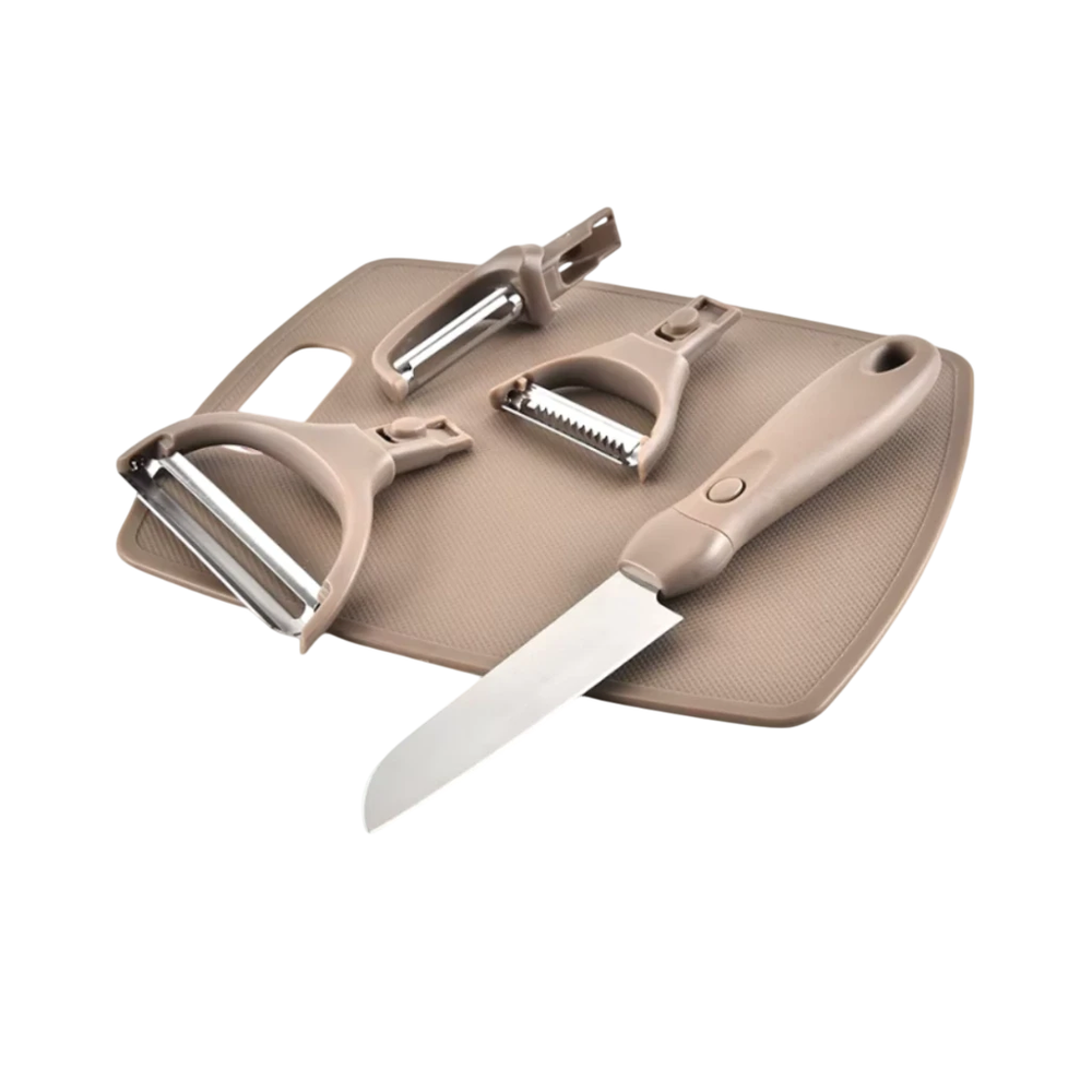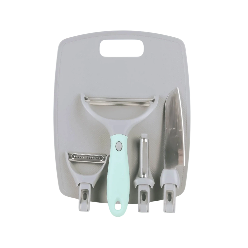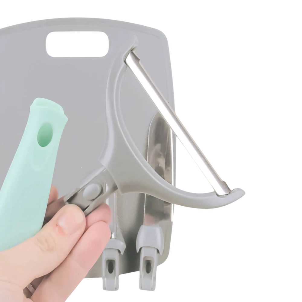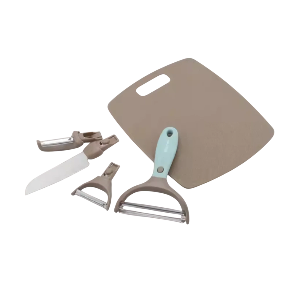 Un set práctico, versátil y compacto que te simplifica la cocina. Incluye 3 peladores con funciones distintas, 1 cuchillo y 1 tabla de corte, todos con un único mango intercambiable que se adapta a cada accesorio para un agarre cómodo, firme y seguro.