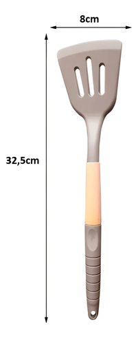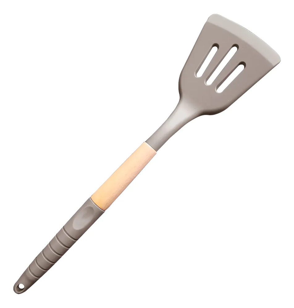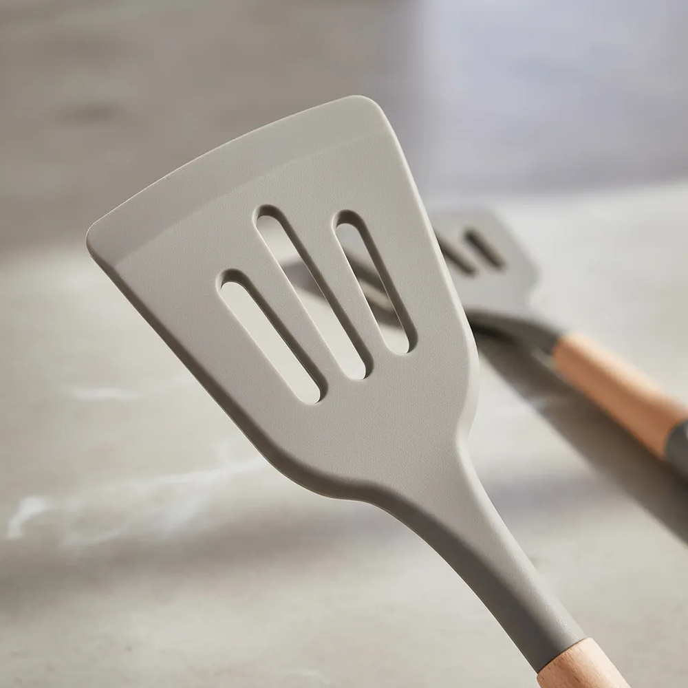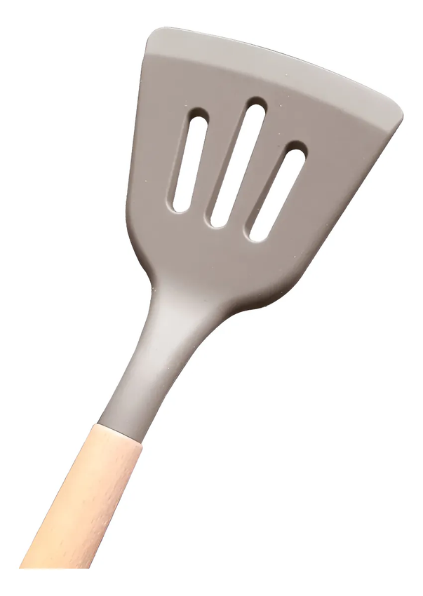 Cociná con comodidad y estilo con esta espátula ranurada ideal para todo tipo de preparaciones. Con mango de madera natural y punta de silicona resistente, es perfecta para usar en sartenes antiadherentes sin rayarlas.
