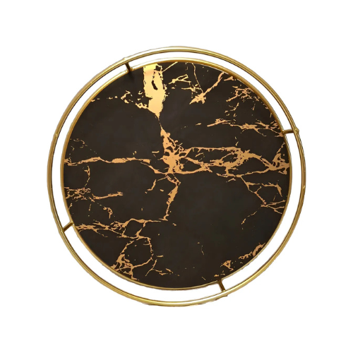 Base en MDF con acabado efecto mármol blanco con vetas doradas, y estructura metálica circular en tono dorado brillante.
