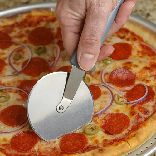 Este práctico cortador de pizza combina funcionalidad y diseño moderno. Con una rueda afilada de acero inoxidable y mango ergonómico, te permite cortar porciones con precisión y sin esfuerzo ✂️. Ideal tanto para el hogar como para cocinas profesionales 👨🍳.