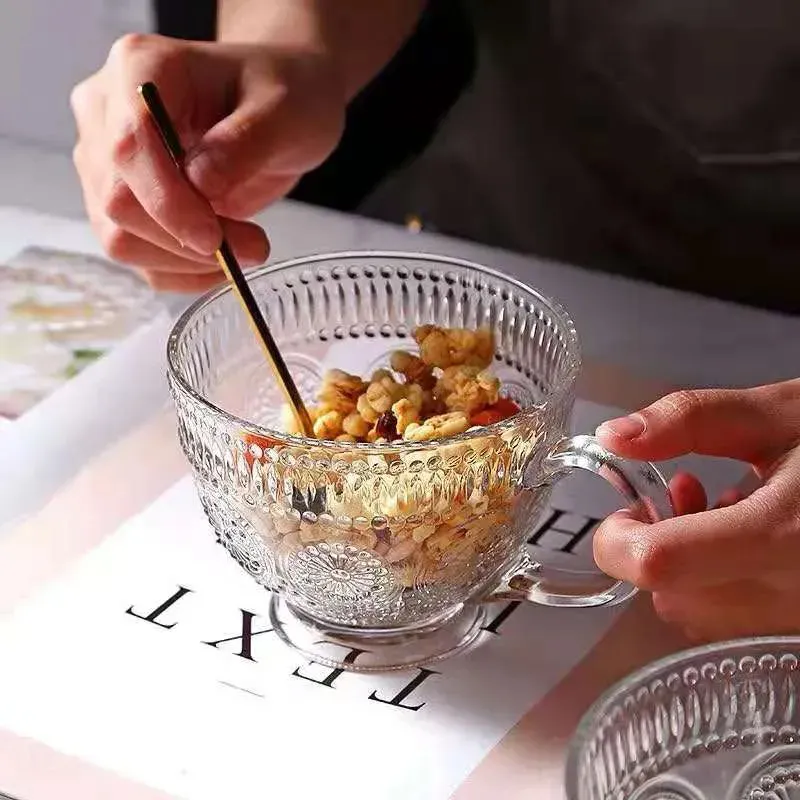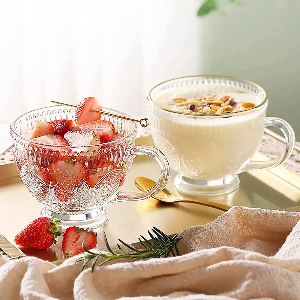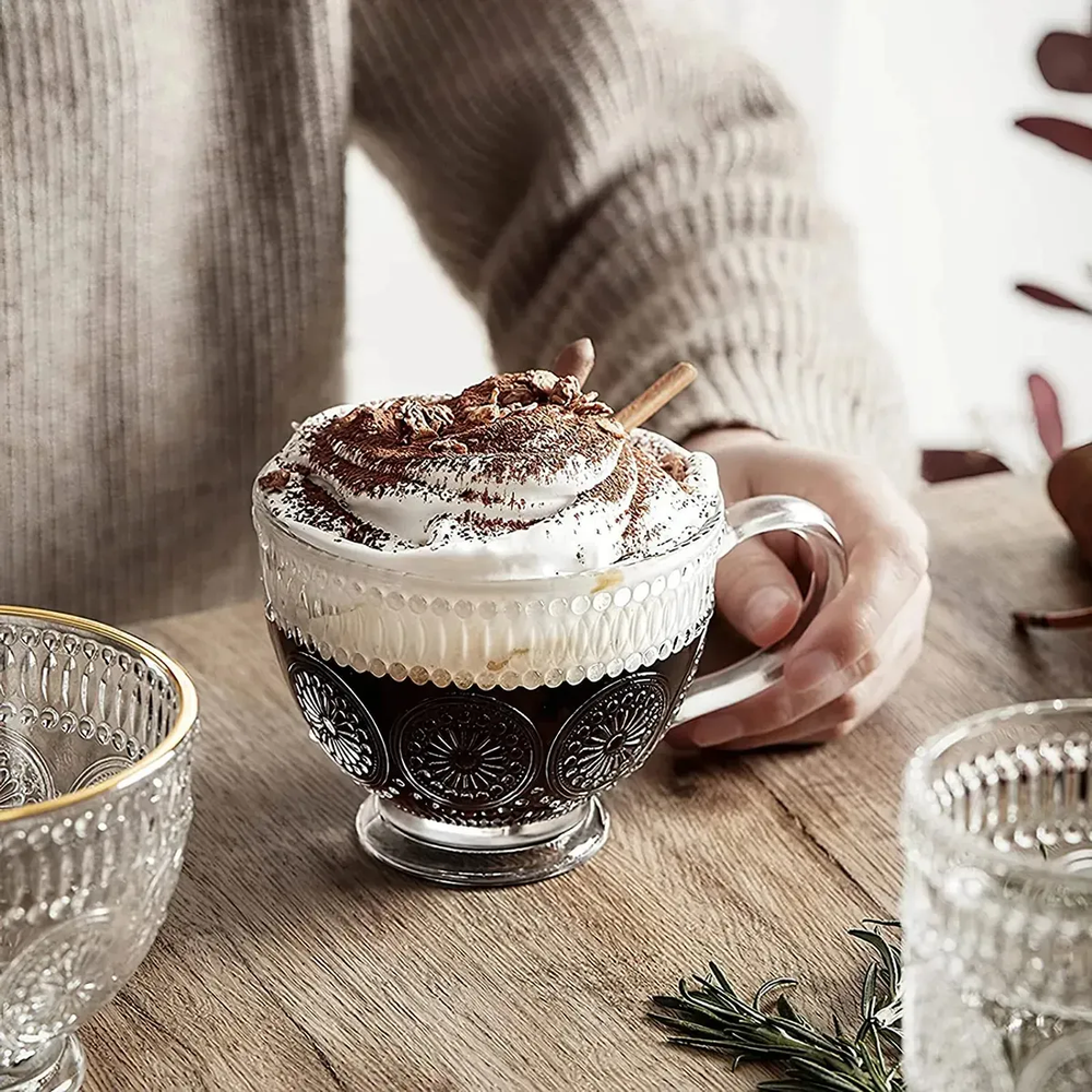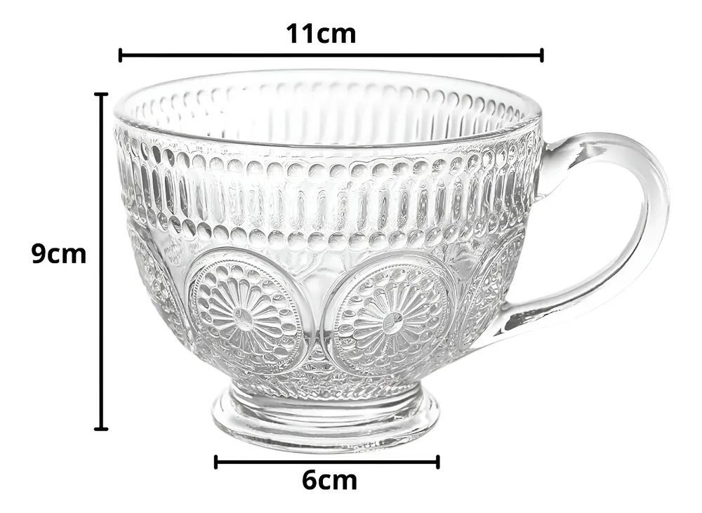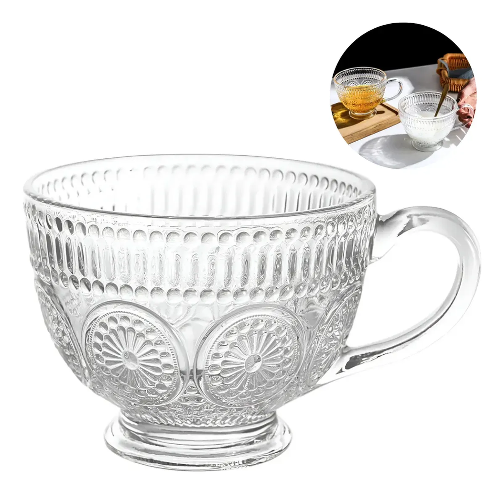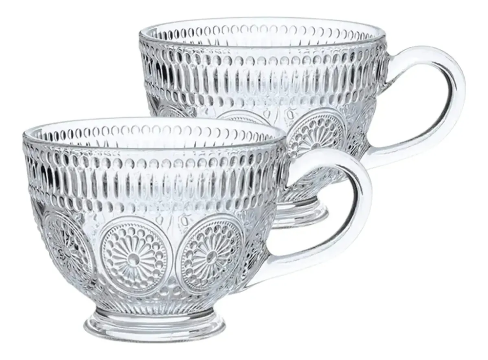 Dale un toque distinguido a tu mesa con este set de 2 tazas labradas de vidrio. Su diseño vintage con relieves decorativos le aporta un aire cálido y sofisticado a cada bebida ✨. Ideales para café, té, infusiones o hasta bebidas frías con estilo.