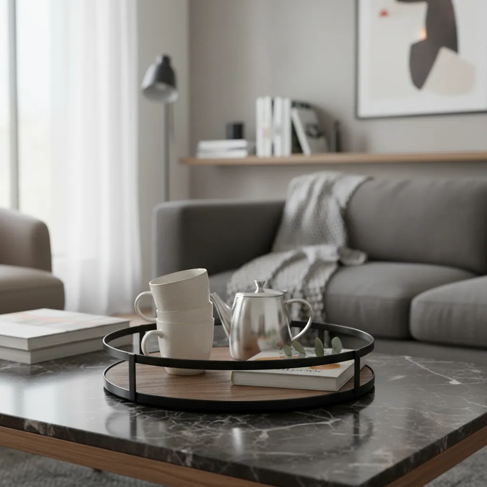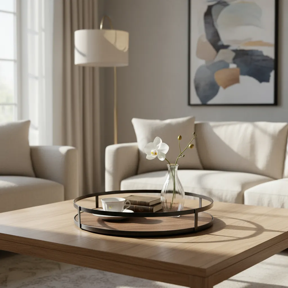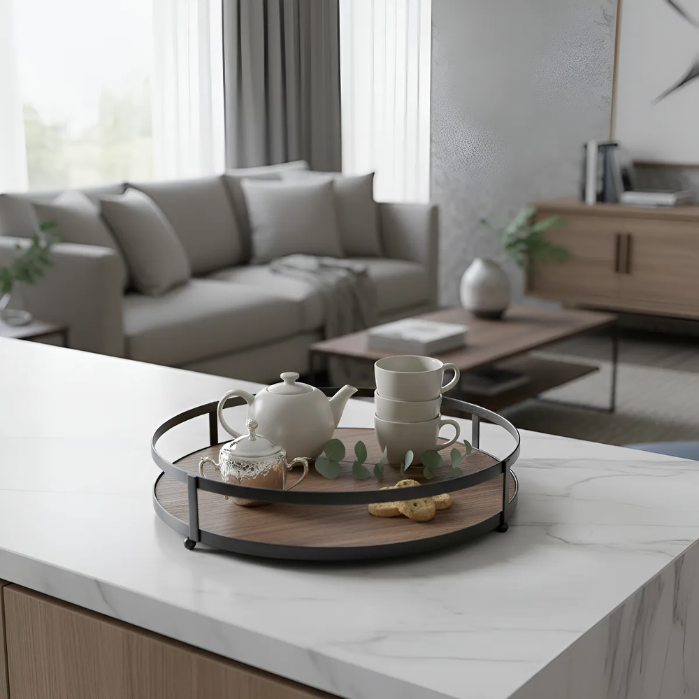 Elegante, práctica y con un diseño que destaca. Esta bandeja redonda combina una base de madera natural con un marco metálico negro, ofreciendo un estilo moderno y versátil para decorar o servir.