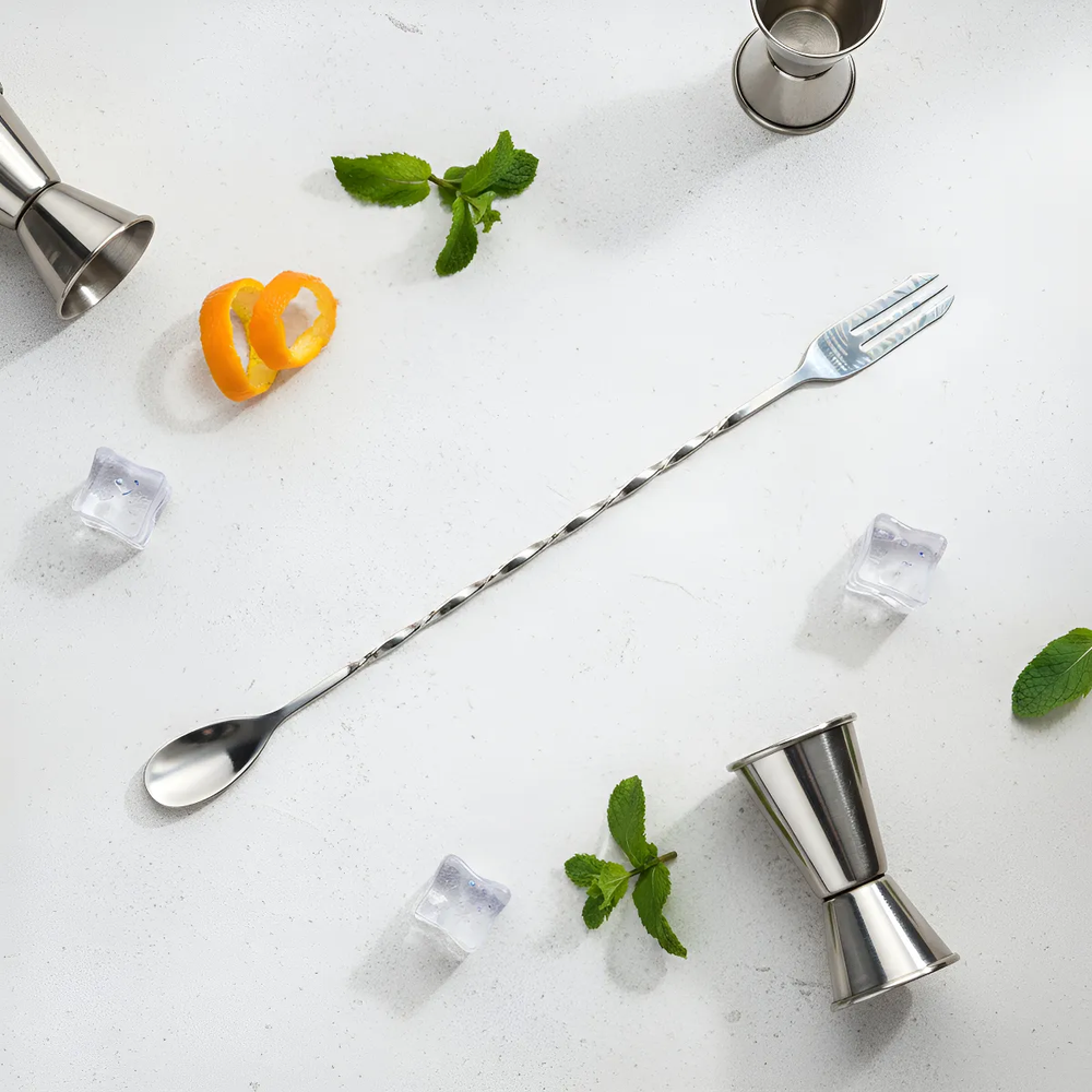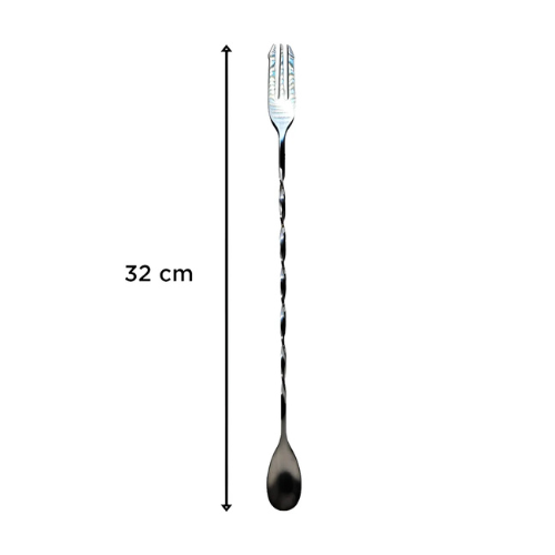• Doble función: cuchara para mezclar + tenedor para manipular frutas, hielo y decoraciones