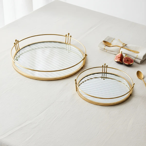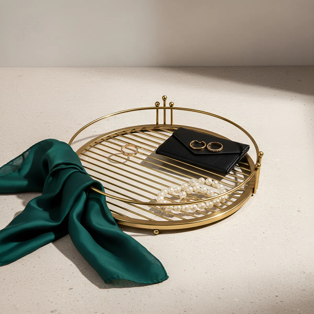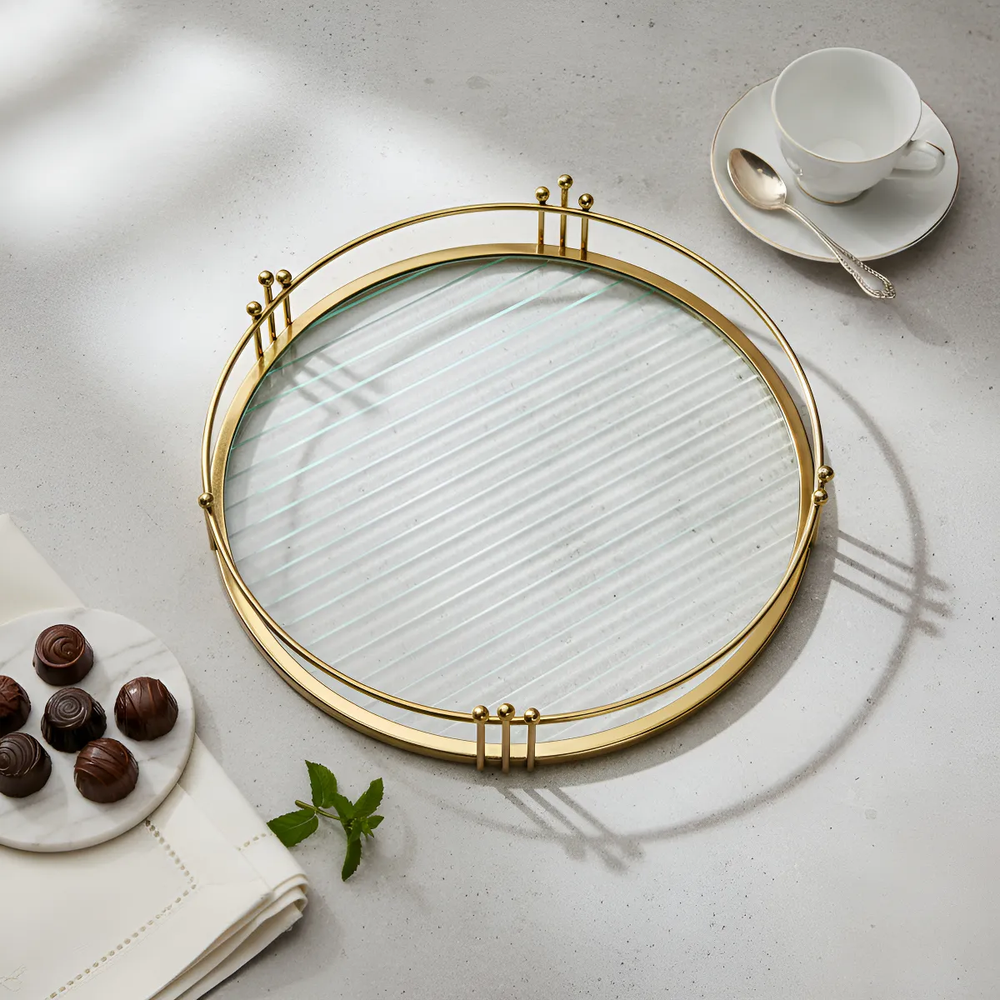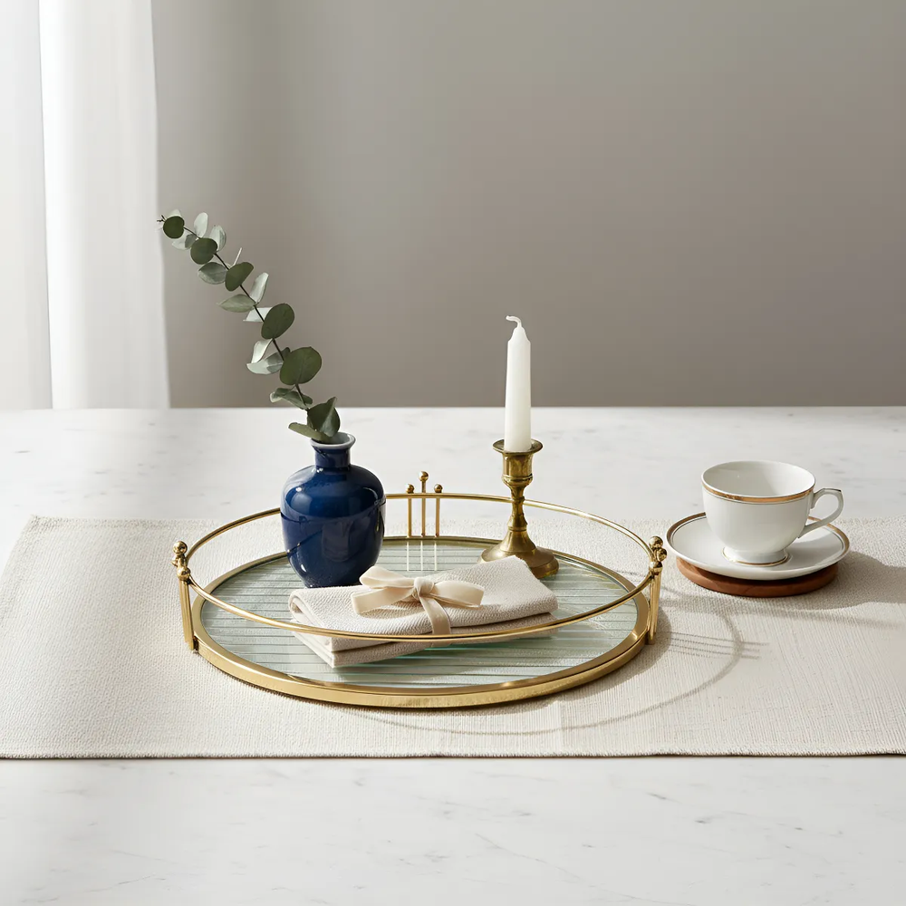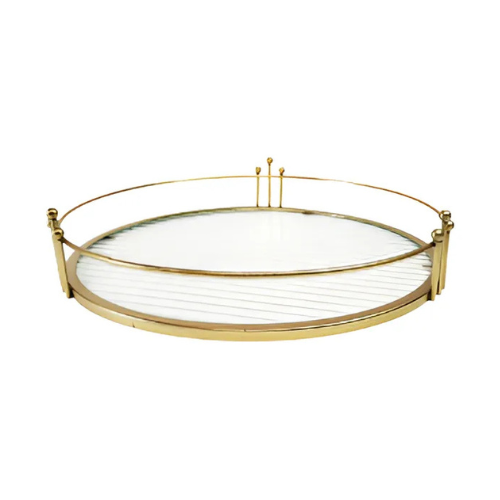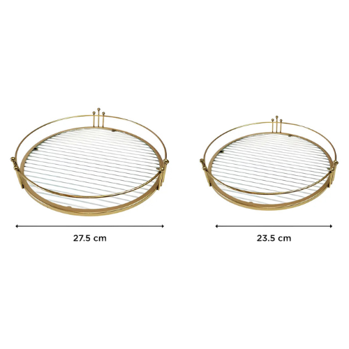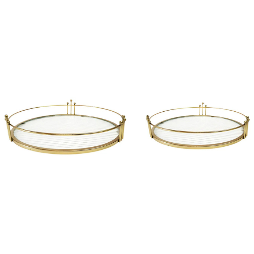 Elegancia y funcionalidad en un solo set. Estas bandejas decorativas combinan estructura metálica dorada con base de vidrio estriado, aportando un estilo moderno y sofisticado a cualquier rincón. Son perfectas para organizar perfumes, cosméticos, velas o destacar centros de mesa.