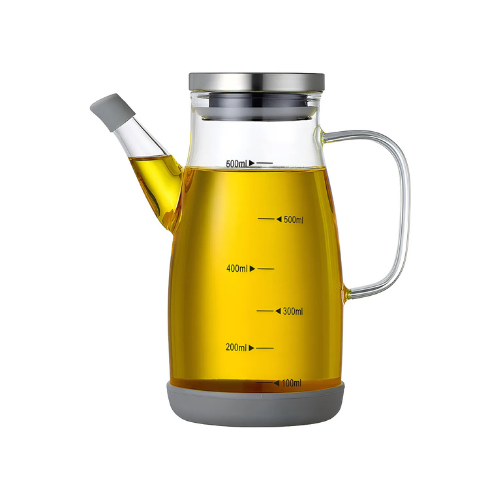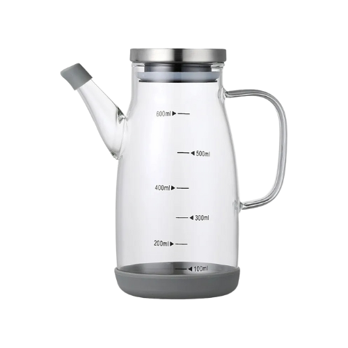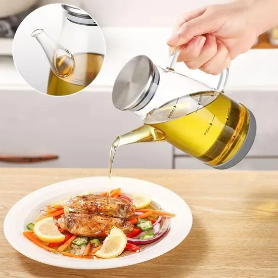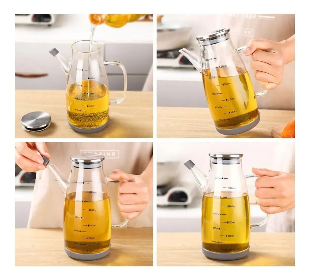 Diseño moderno, materiales de alta calidad y máxima funcionalidad. Esta aceitera de vidrio borosilicato es ideal para conservar y dosificar aceite, vinagre u otros líquidos de cocina con precisión y estilo.