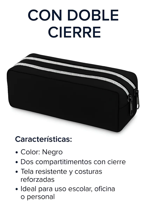Cartuchera de diseño clásico, resistente y funcional, ideal para estudiantes, docentes u oficina. Cuenta con dos compartimentos con cierre para mantener tus elementos siempre ordenados y a mano.