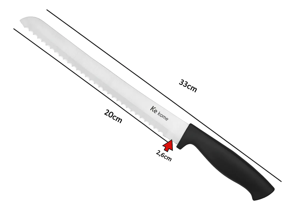 1️⃣ Cuchillo para pan: Largo total 33 cm • Hoja 20 cm • Altura 2,6 cm