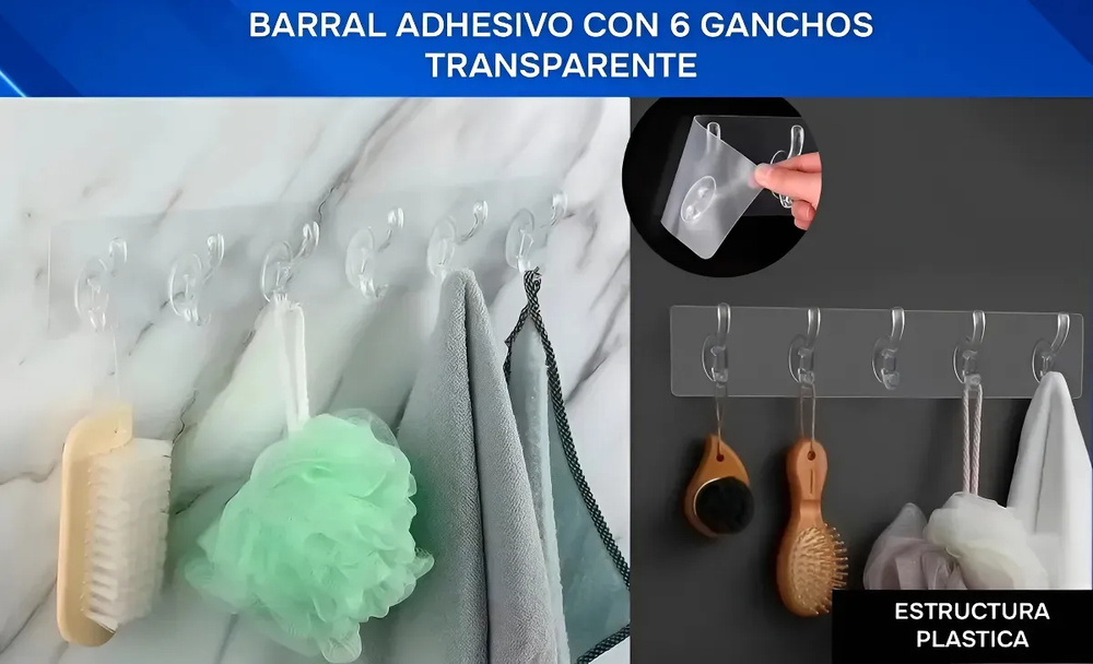 Mantené tus espacios ordenados y funcionales con este práctico barral adhesivo de 6 ganchos, ideal para colgar utensilios, toallas, repasadores o accesorios sin necesidad de perforar paredes. Su diseño optimiza el espacio y aporta comodidad en el día a día.
