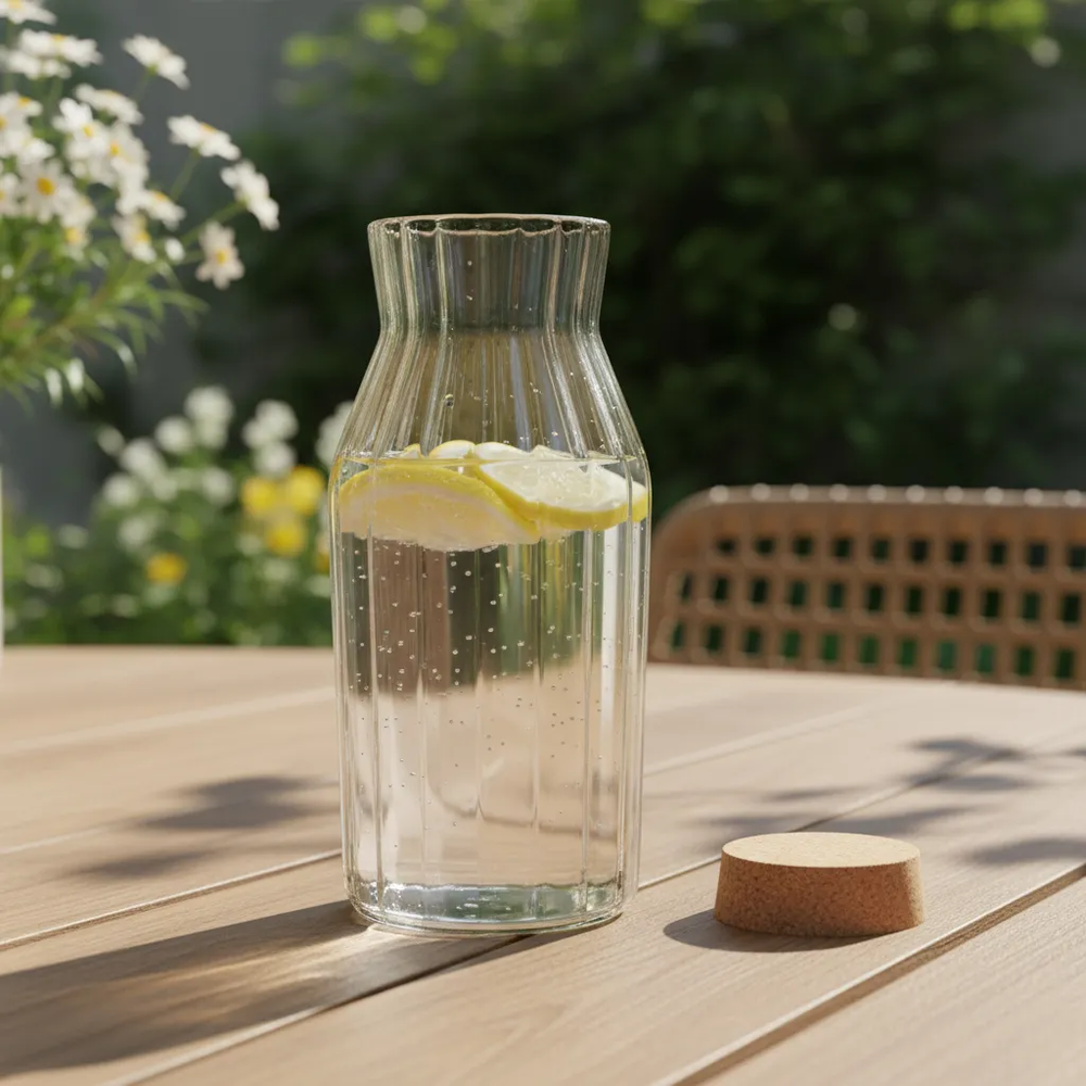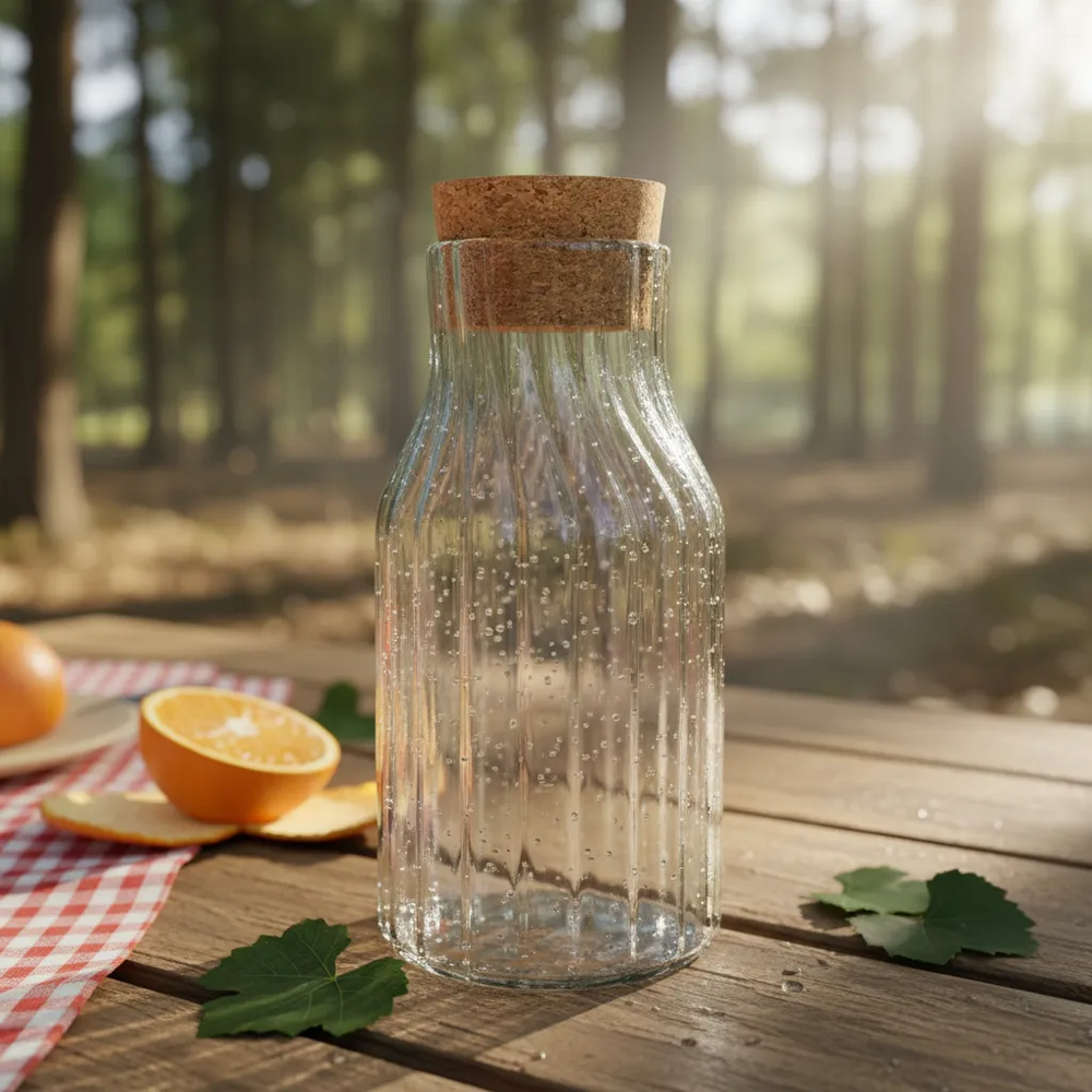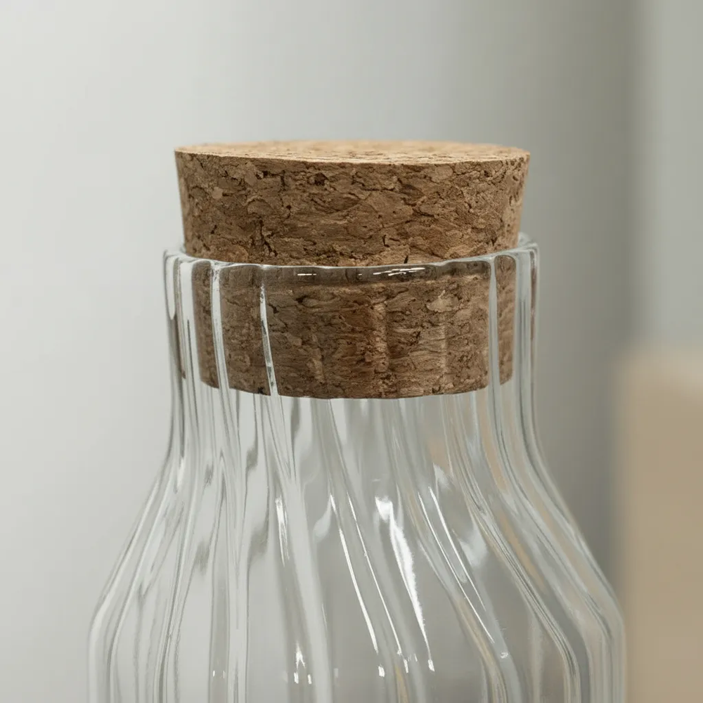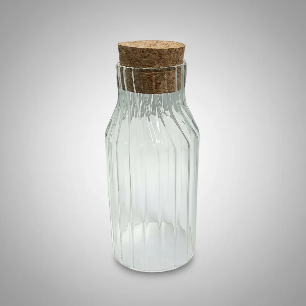 Botella de vidrio con diseño acanalado y tapa de corcho natural, perfecta para conservar agua, jugos, leche vegetal o para sumar un detalle decorativo elegante en tu cocina, comedor o mesa. Su estética transparente y textura ergonómica aportan un estilo distintivo y moderno.