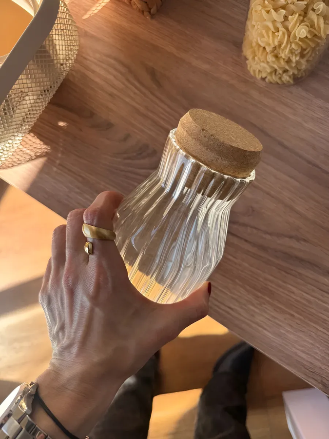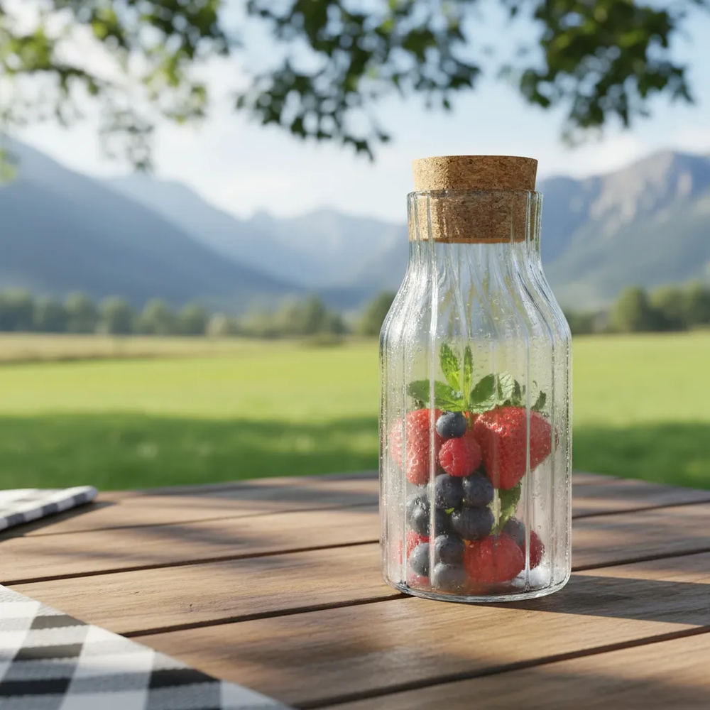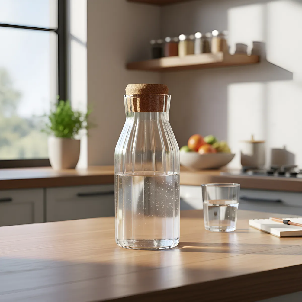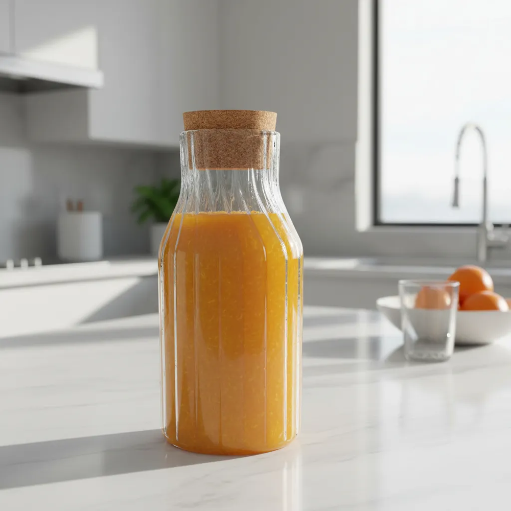 Botella de vidrio con diseño acanalado y tapa de corcho natural, perfecta para conservar agua, jugos, leche vegetal o para sumar un detalle decorativo elegante en tu cocina, comedor o mesa. Su estética transparente y textura ergonómica aportan un estilo distintivo y moderno.