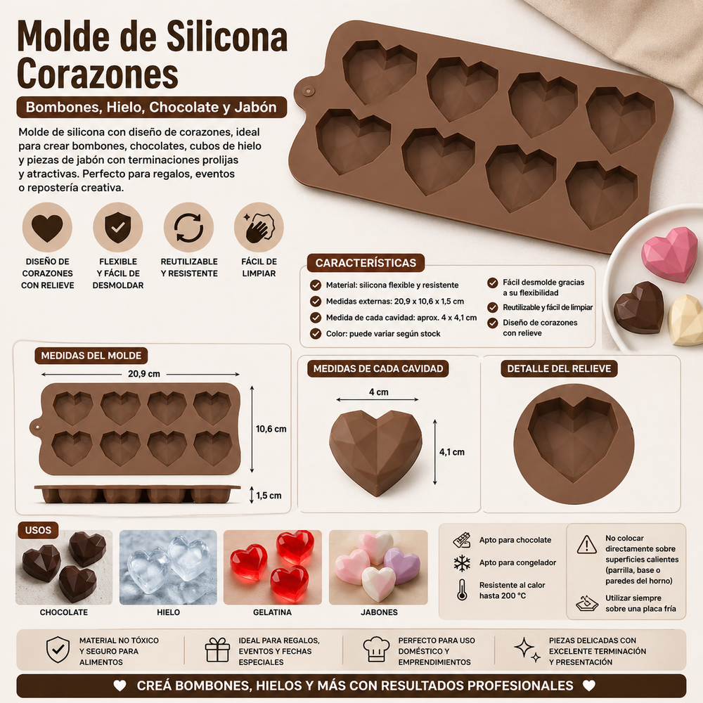 Dale un toque especial a tus creaciones con este molde de silicona con diseño de corazones 💕 Ideal para hacer bombones, chocolates, cubos de hielo o jabones con terminaciones prolijas y súper atractivas. Perfecto para regalos, eventos o repostería creativa 🎁✨