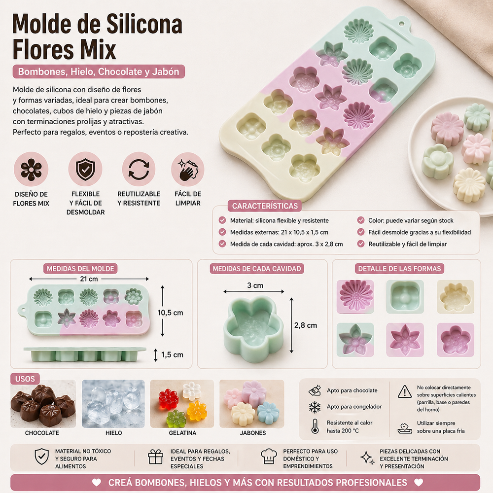 Dale un toque creativo y delicado a tus preparaciones con este molde de silicona con diseños de flores variadas 🌼. Ideal para crear bombones, chocolates, hielos, gelatinas o velas decorativas con terminaciones prolijas y profesionales.