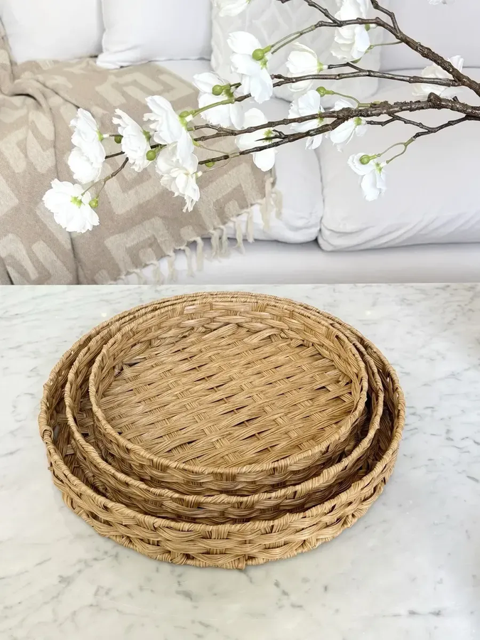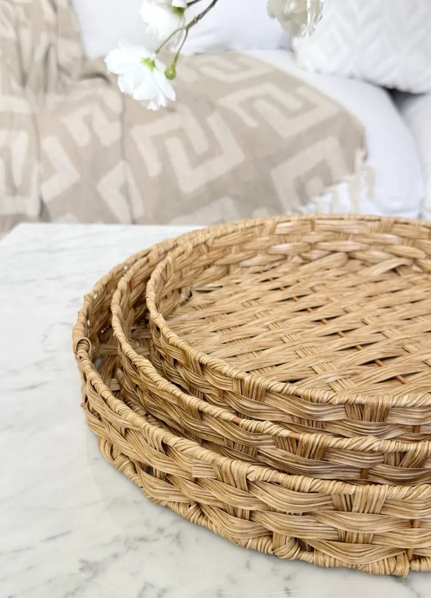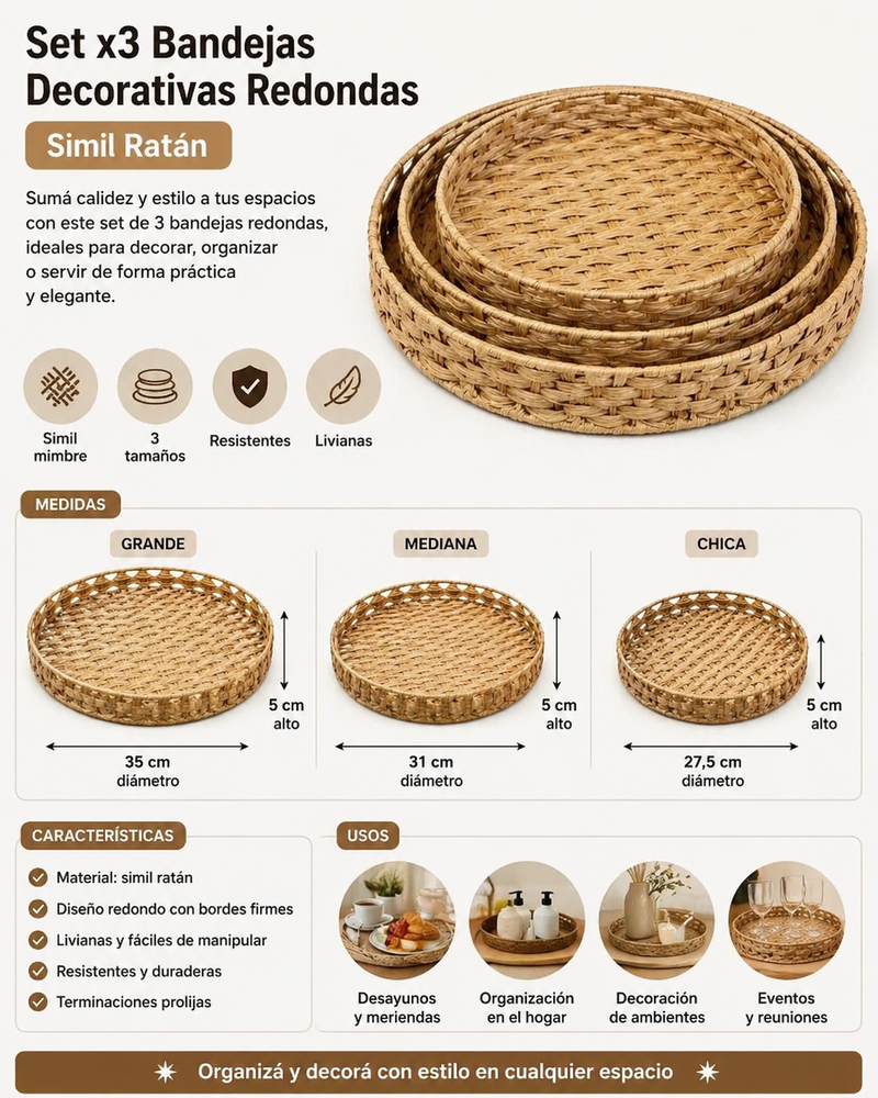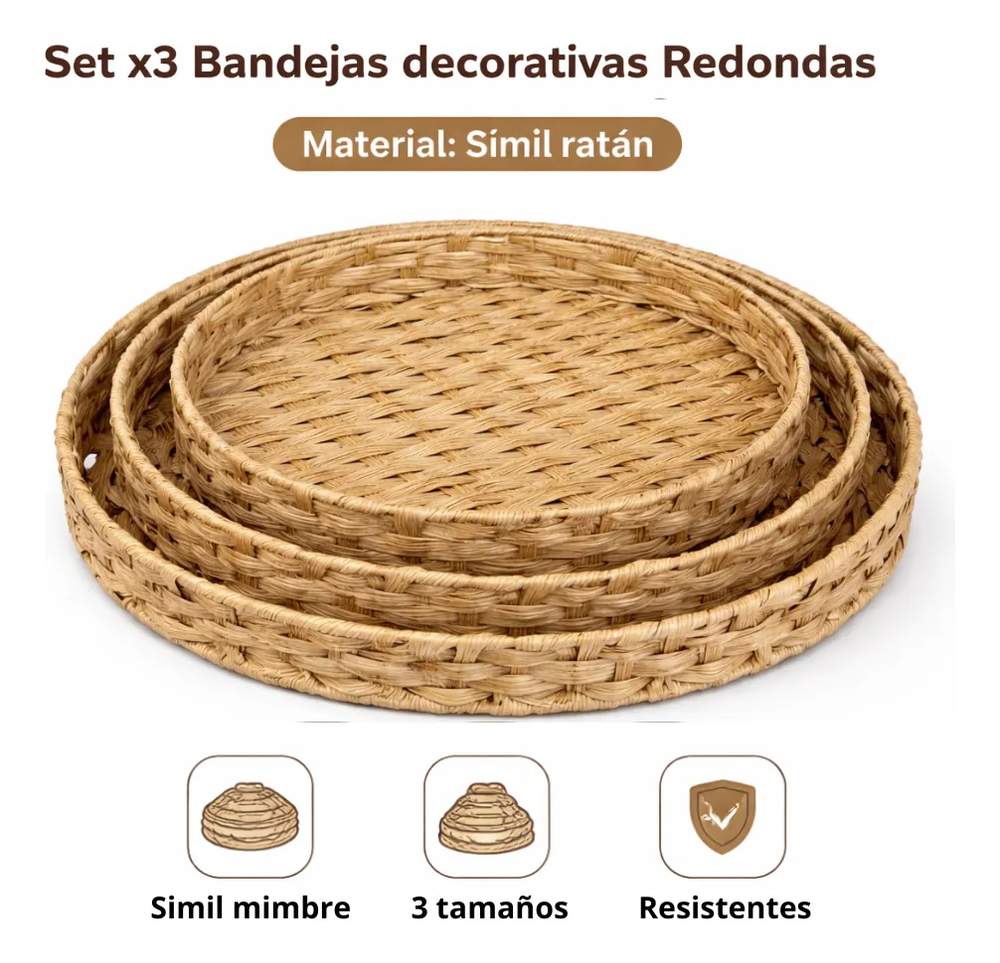 🧺 Set x3 Bandejas Decorativas Redondas Simil Ratán 🧺